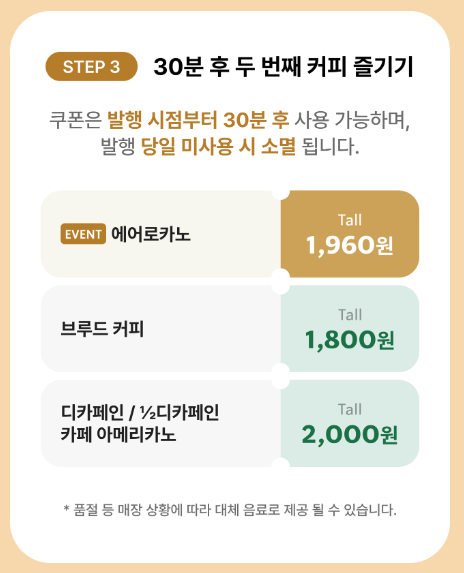 - 주의사항: 무료 음료 쿠폰을 사용하여 주문할 경우 이벤트 참여가 불가합니다.