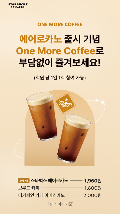 - 쿠폰 발행: 첫 번째 에어로카노 주문 시 자동으로 ‘One More Coffee’ 쿠폰이 발행됩니다. (1일 1회)