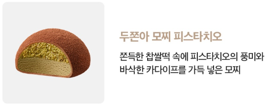 - 배라의 시그니처 디저트인 모찌 속에 피스타치오와 리얼 카다이프를 듬뿍 채웠습니다.