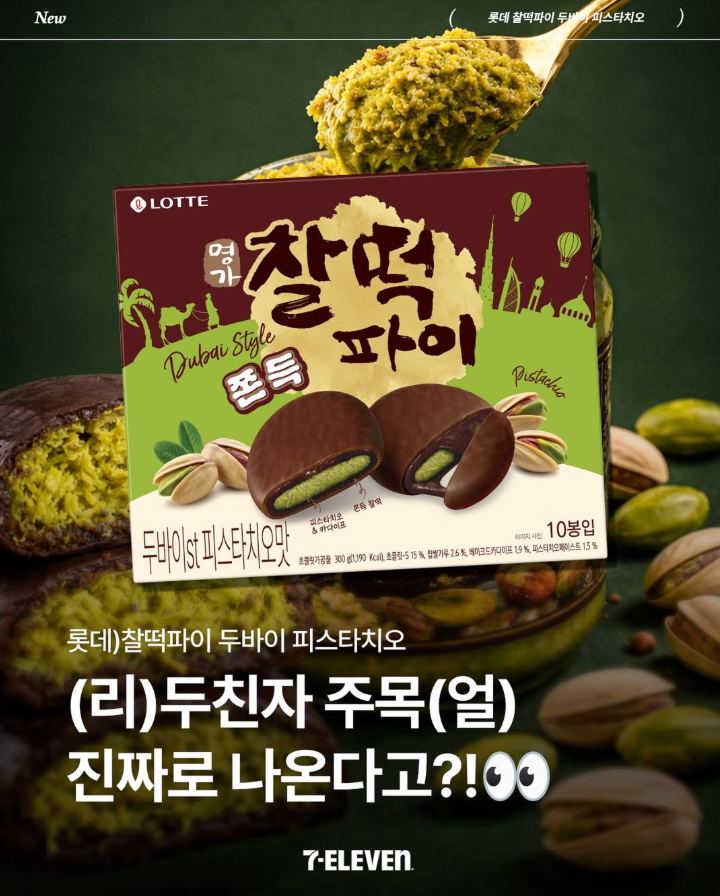 세븐일레븐에서 드디어 **'롯데 찰떡파이 두바이 피스타치오'**를 선보인다고 하는데요!