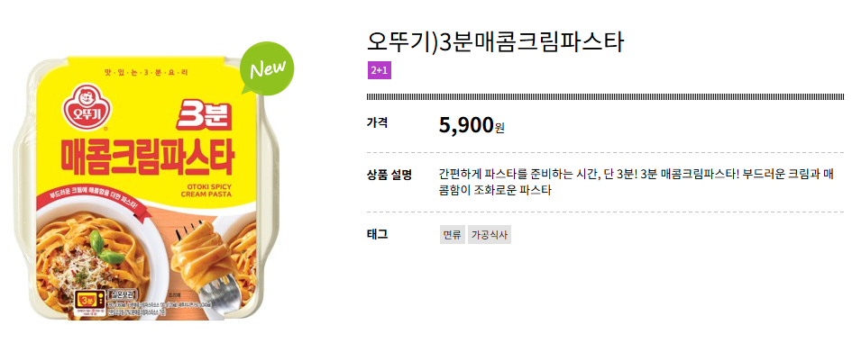 | 매콤크림파스타 | 5,900원 | 크리미+매콤 | 비엔나 소시지 권장 | 전자레인지 3분 |