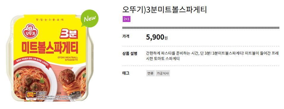 | 미트볼스파게티 | 5,900원 | 토마토+달콤짭짤 | 미트볼 3개 포함 | 전자레인지 3분 |