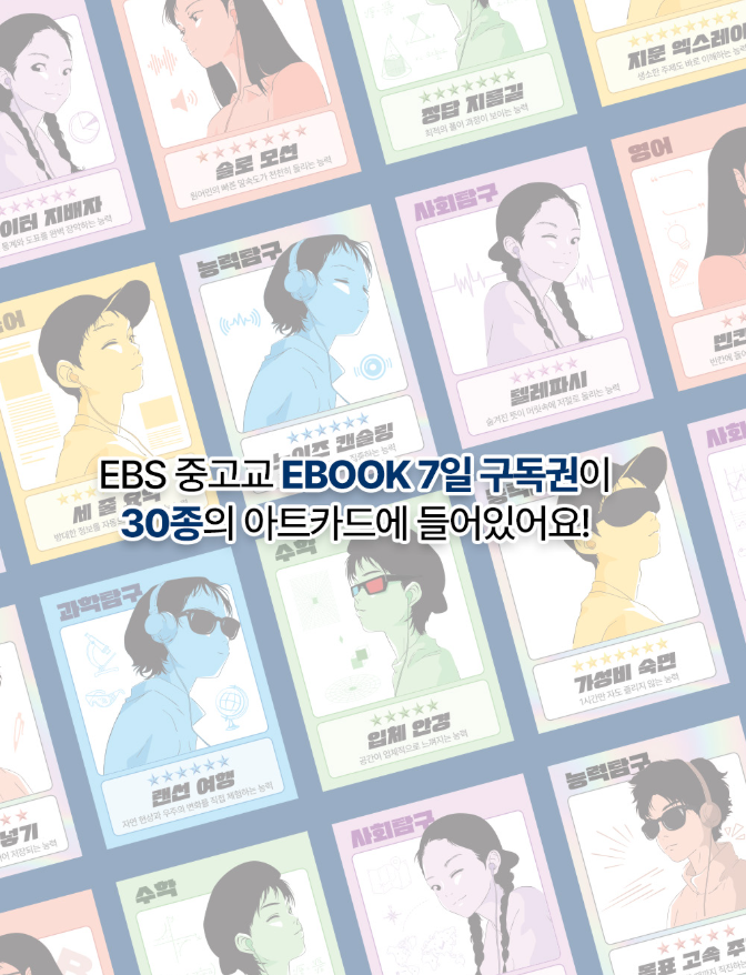 - EBS EBOOK 구독권: 아트카드 후면의 QR코드를 스캔하면 EBS 중고교 EBOOK 7일 구독권을 등록하여 사용할 수 있습니다.
