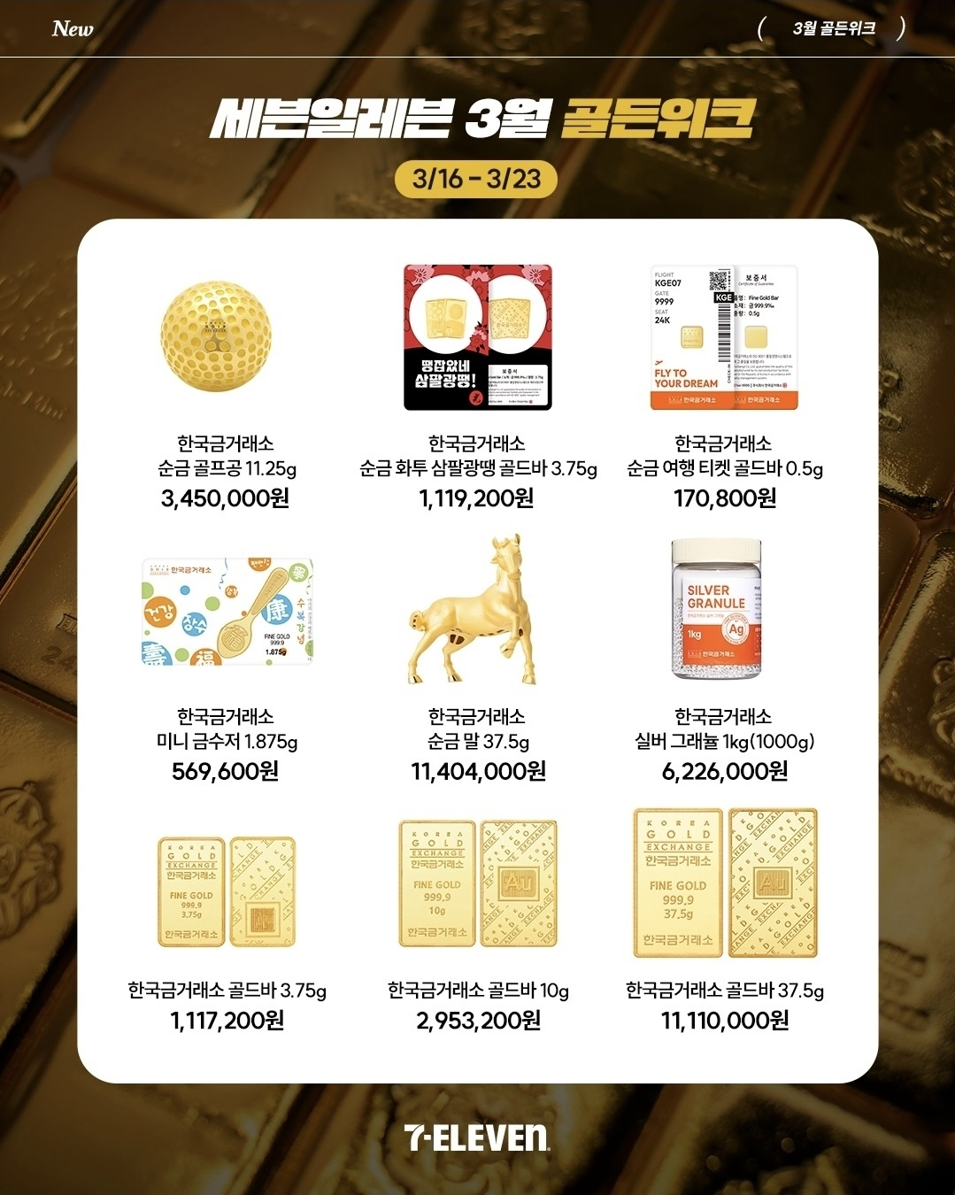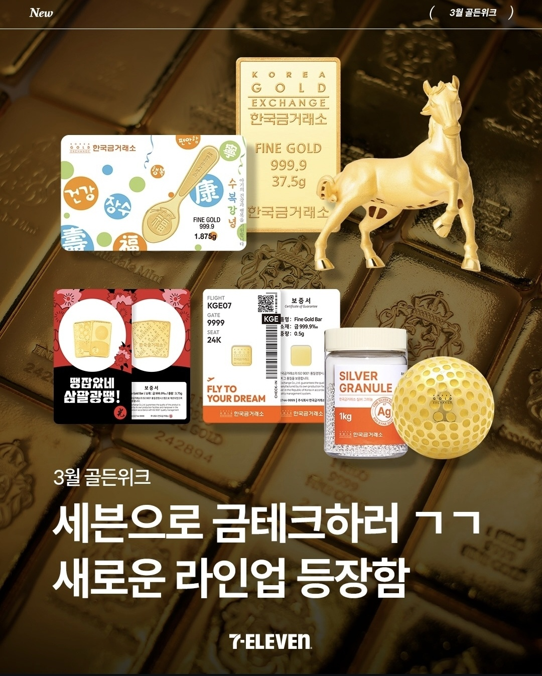 바로 **'세븐일레븐 골든위크'**를 맞아 한국금거래소와 함께 선보이는 역대급 순금 라인업인데요.