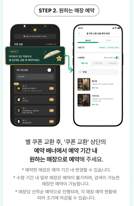 - 별 쿠폰 교환: 스타벅스 앱 내에서 그동안 모아둔 별 50개를 전용 쿠폰으로 교환합니다. (자동 발행)
