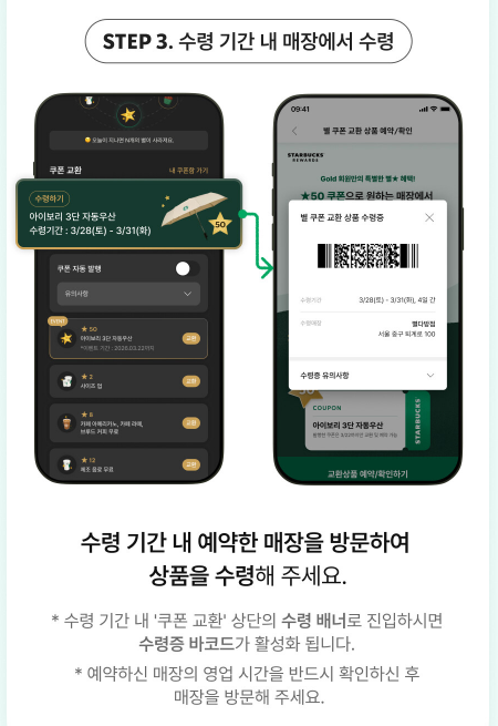 2. 수령 기간 확인: 3월 31일(화)까지인 수령 기간을 놓치게 되면 상품을 받을 수 없으니 꼭 기간 내에 방문해 주세요.