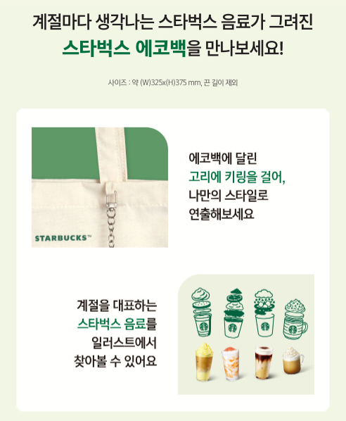- 에코백 전면에는 스타벅스를 대표하는 각 계절별 음료 일러스트가 정교하게 프린트되어 있습니다.