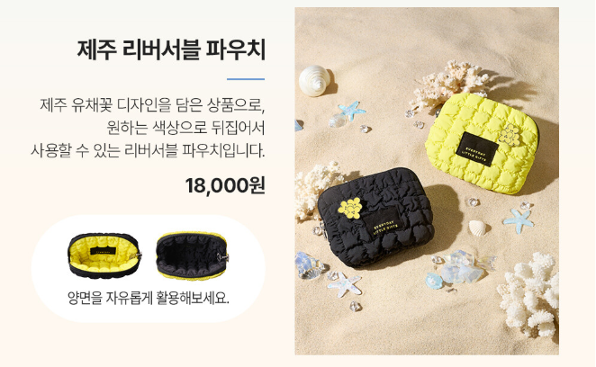 - 특징: 활짝 핀 유채꽃 디자인이 돋보이며, 기분에 따라 노란색과 검은색 양면으로 사용 가능한 실용적인 파우치입니다.