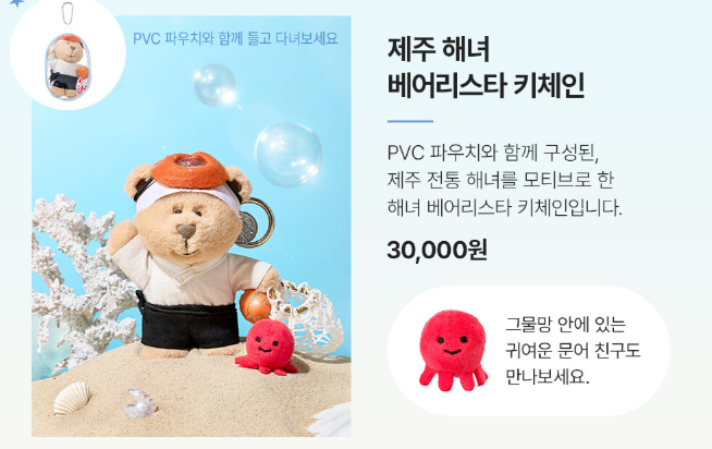 - 특징: 제주의 상징인 해녀로 변신한 베어리스타입니다. 투명한 PVC 파우치와 앙증맞은 문어 인형이 세트로 구성되어 가방에 포인트로 달기 좋습니다.