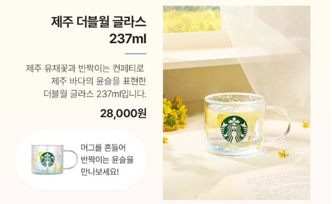 2. 제주 한정 음료와 함께: 제주 MD를 구매하면서 '제주 쑥떡 크림 프라푸치노'나 '제주 비자림 콜드 브루' 같은 제주 전용 음료를 담아 인증샷을 남겨보세요. 완벽한 제주 여행의 기록이 됩니다.