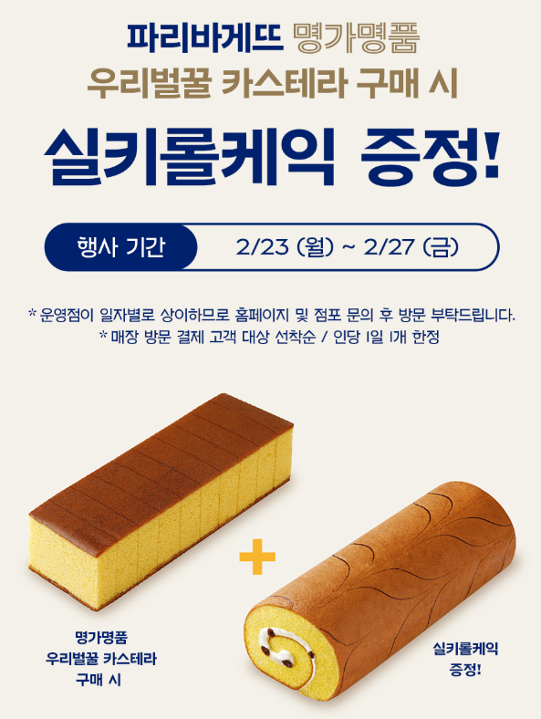 - 혜택: 카스테라 사면 실키롤케익 무료 증정!